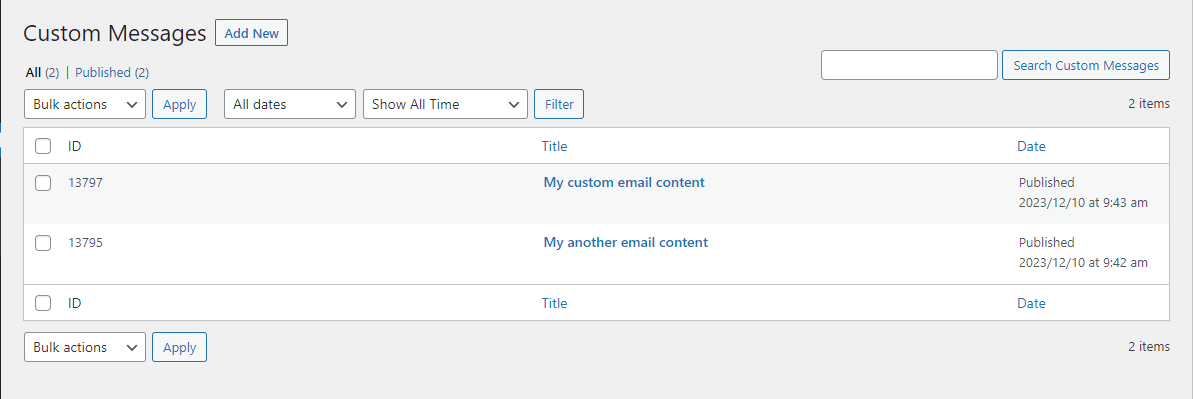 – Navigate to ‘Custom Emails’ > ‘Add New Message’.