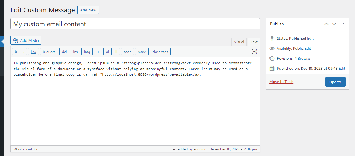 – Publish a message intended to appear in your emails. Note that auto-generated content, such as shortcodes,