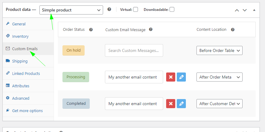 – Scroll down to the ‘Product Data’ section and locate the new ‘Custom Emails’ tab.