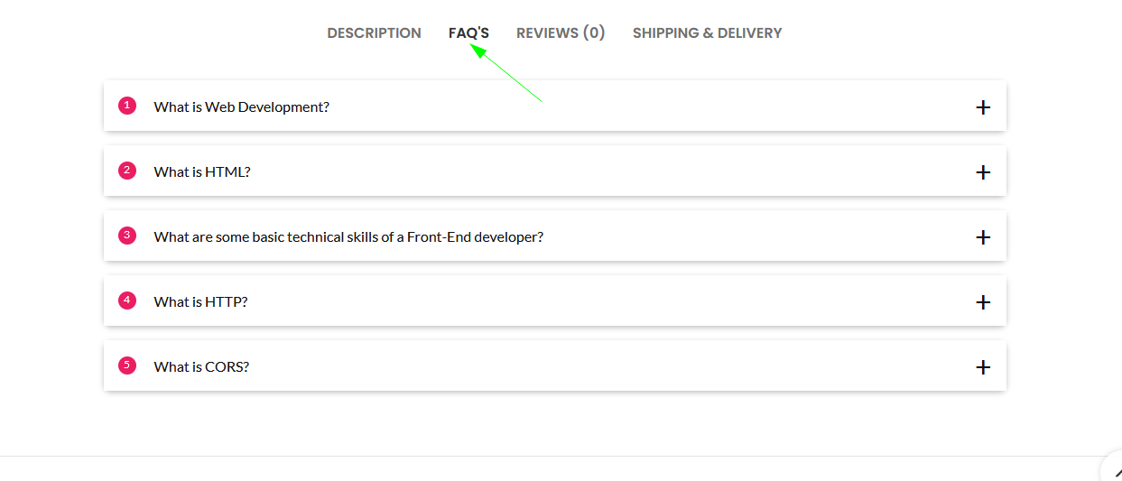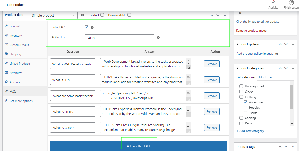 product data tabs, locate the FAQs section. Here, you can add FAQs by providing titles and descriptions.